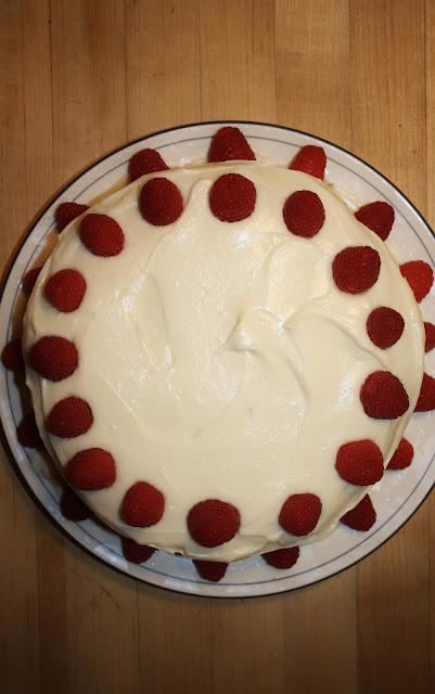 Place one cake layer on a plate, and level it out, if needed. Pipe a line of frosting around the edge of the cake to prevent a spillage of curd. Fill with curd (you will have lots of extra curd: fear not, it keeps beautifully and there are millions of uses for it), layer on some raspberries, and top with other cake. Frost cake with the icing, and decorate with the prettiest, most photogenic berries.