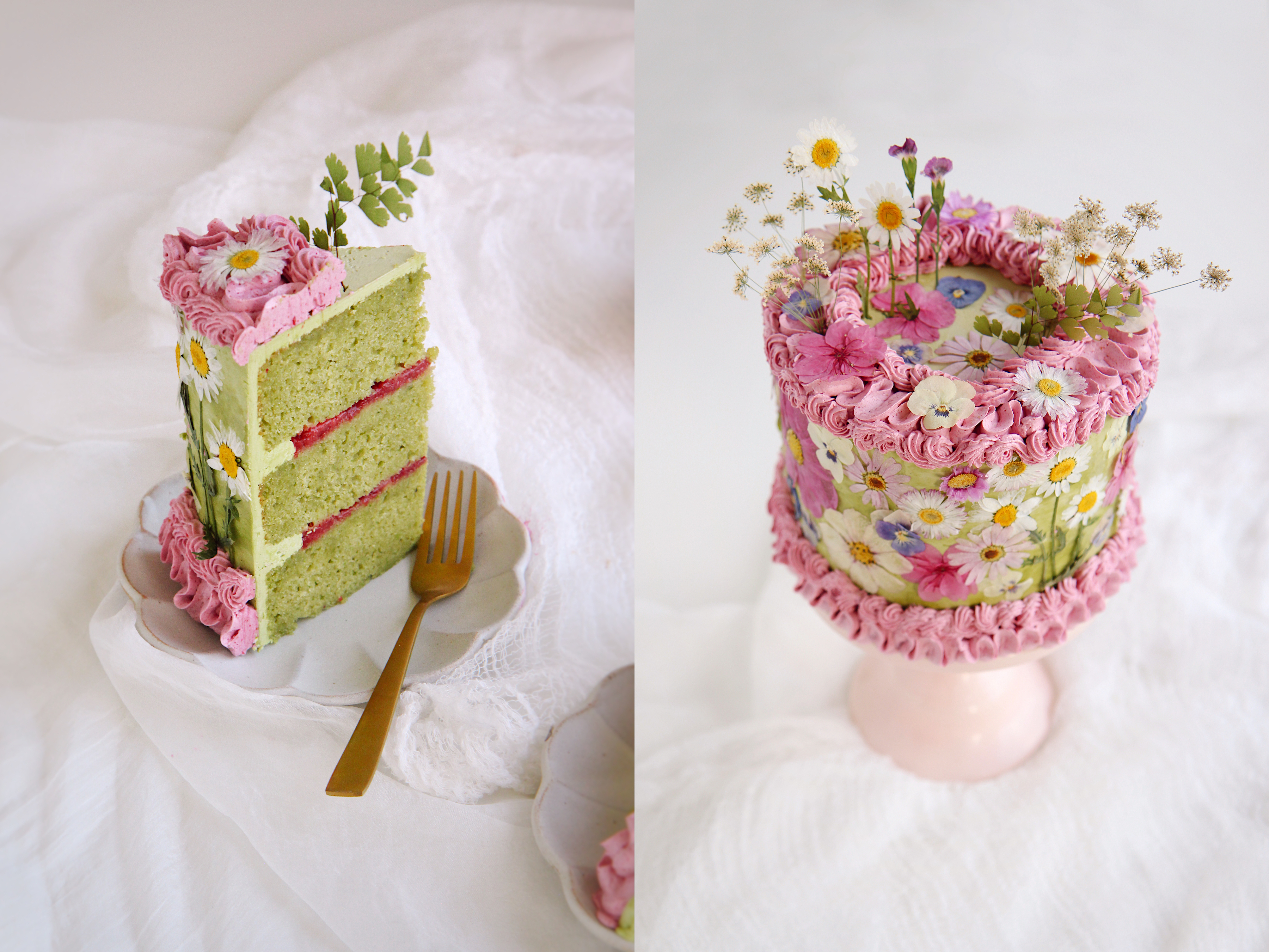 For my birthday cake, I decided I wanted to recreate the flavors of this drink: a dense matcha butter cake that is made all the more moist with a simple syrup soak, filled with barely sweetened roasted strawberry jam, which concentrates the fruit’s flavor, and frosted with a faintly bitter, green, and grassy matcha buttercream as well as a sweet strawberry buttercream. The whole cake is naturally colored and decorated with a riot of dried flowers.