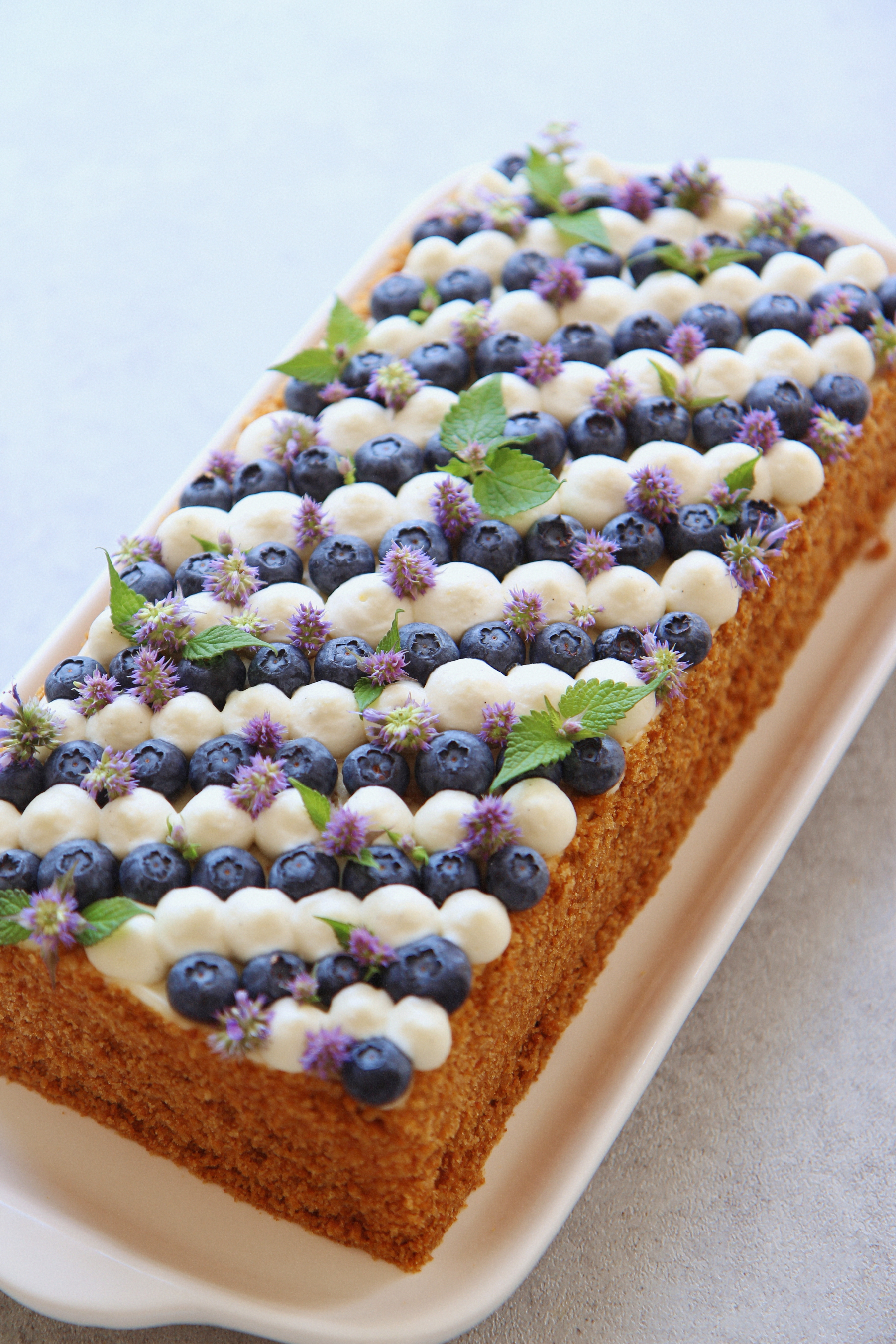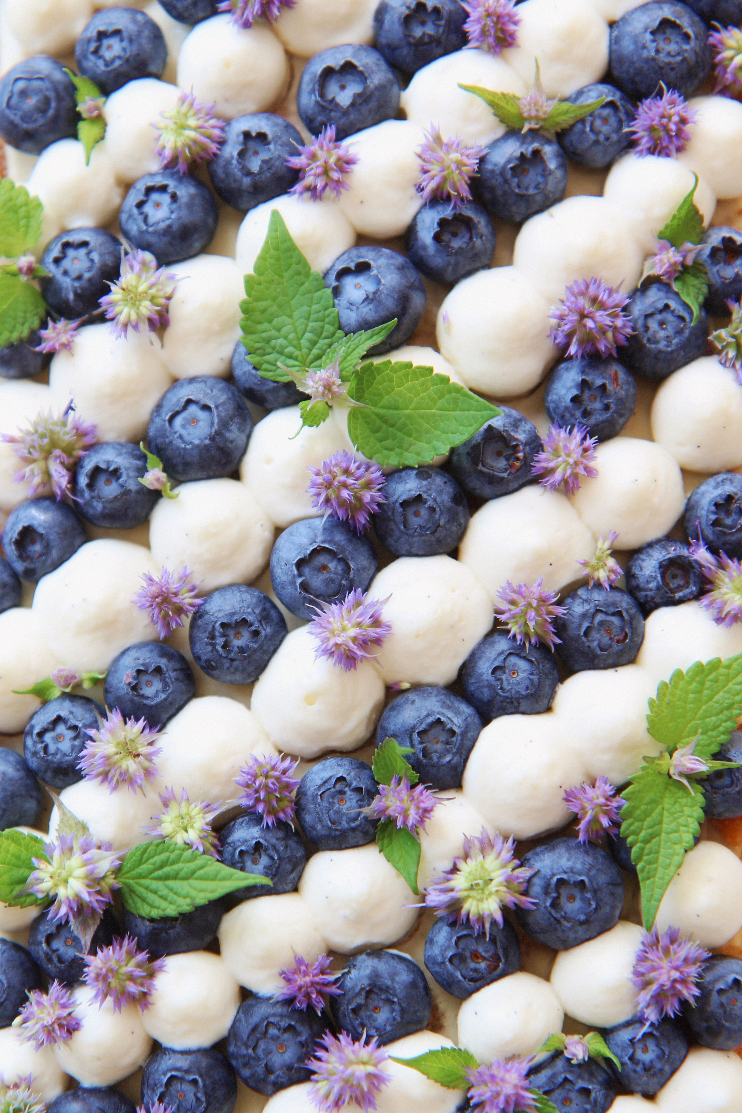 For the top, decorate as desired (I first arranged the blueberries and then piped little blobs of frosting between them).
