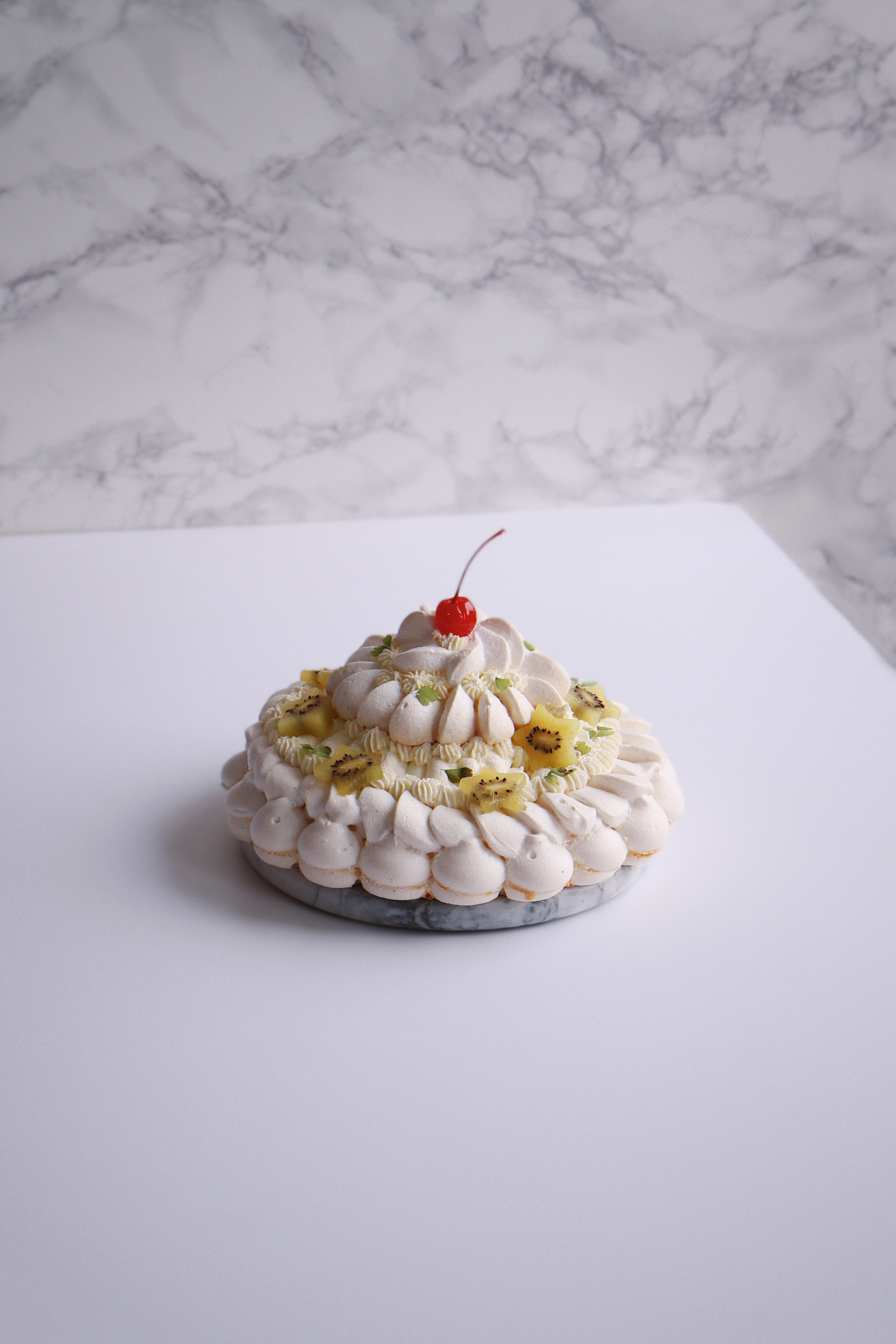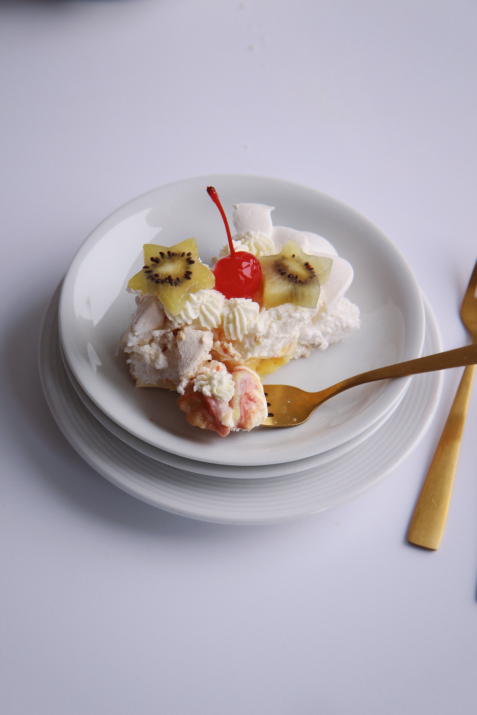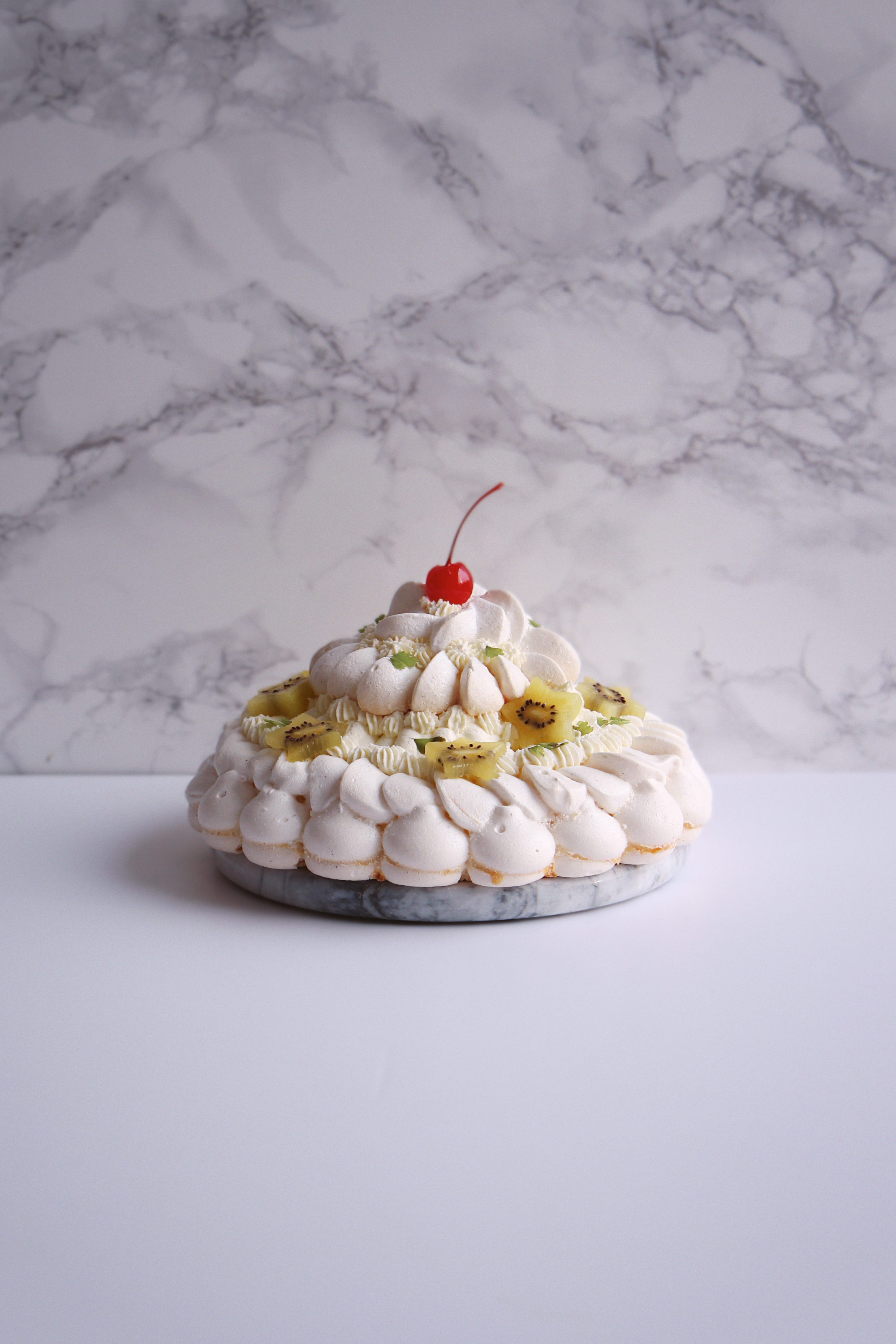 It’s got the usual crisp meringue base with marshmallowy center piled high with cream.