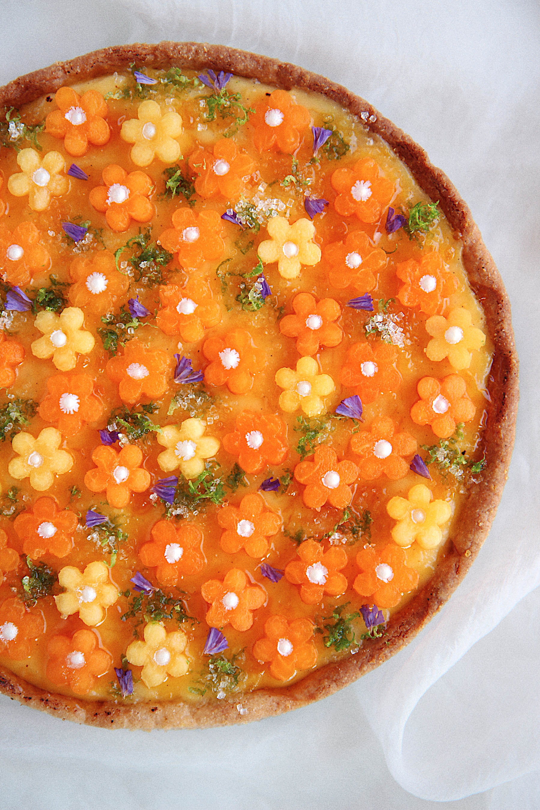 On top, peaches, apricots, lime zest, and sanding sugar are scattered around haphazardly.